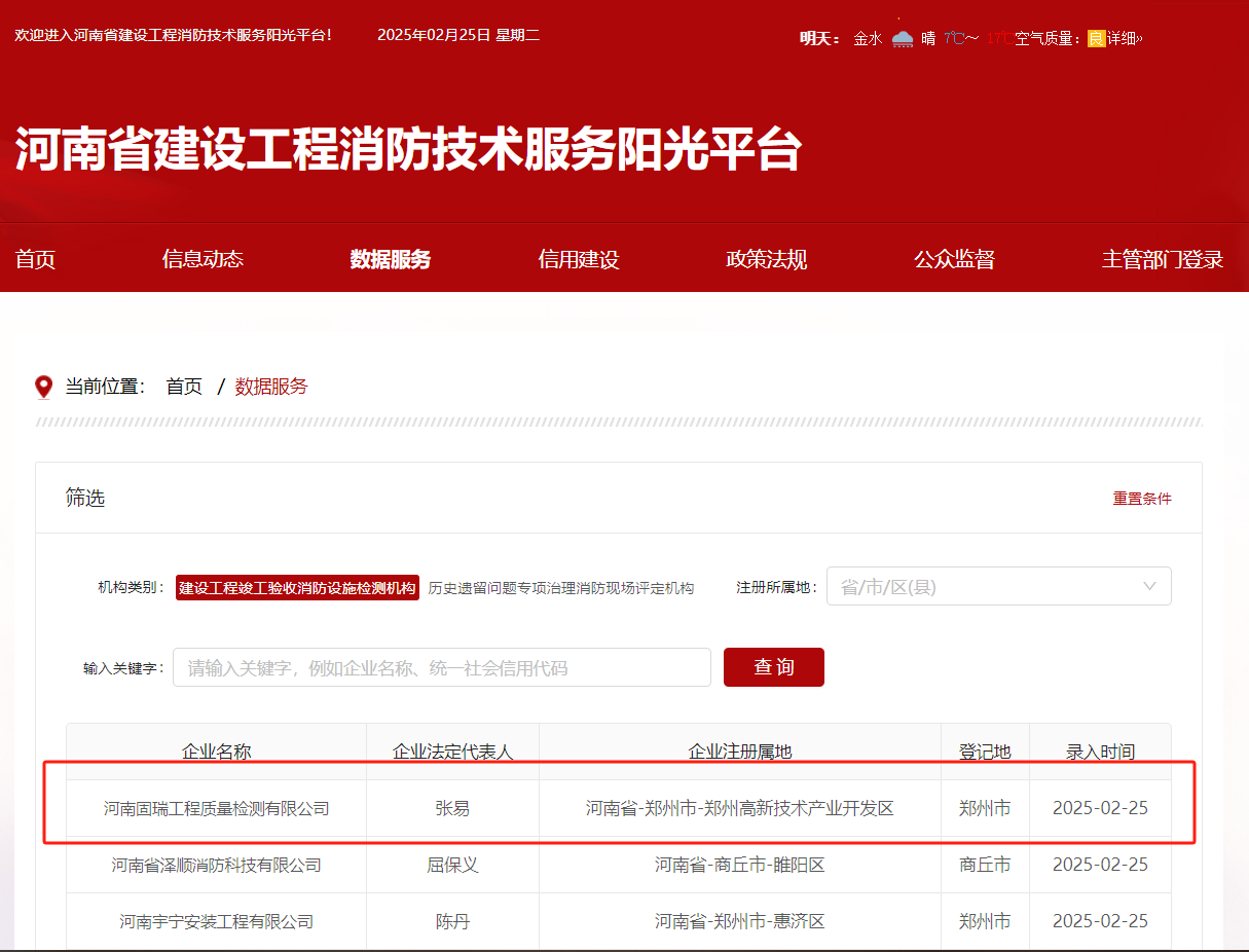 熱烈祝賀河南固瑞工程質(zhì)量檢測(cè)有限公司入冊(cè)河南省建設(shè)工程消防技術(shù)服務(wù)陽(yáng)光平臺(tái)!??!